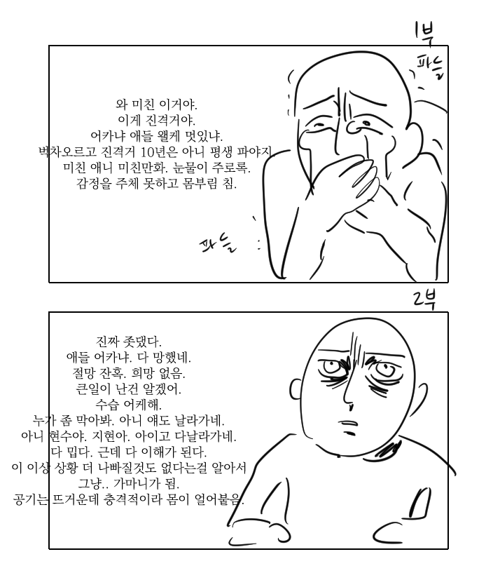 좋았다는 의미. 1부는 캐릭터에 맞춰서 감정이입하게 되면 2부는 상황에 맞춰서 따라가는 느낌.